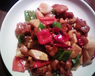 具材は、鶏肉、ピーマン、赤ピーマン、竹の子、ナッツ、キノコ、唐辛子かな。