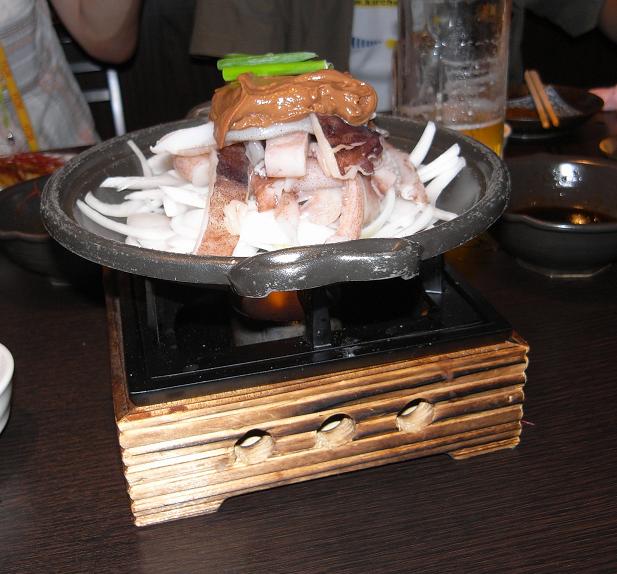 簡易コンロの上に鍋があり、その上に玉ねぎのスライス、生イカの切り身、イカの腸(わた)が乗ったものである。これはその調理前のもの。